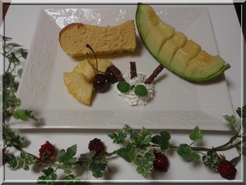 このシフォンケーキと、缶詰じゃないフルーツを盛り合わせて、