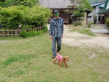 ピンクのワンピを着たワンちゃんをおじさんが一人で散歩させているのって、