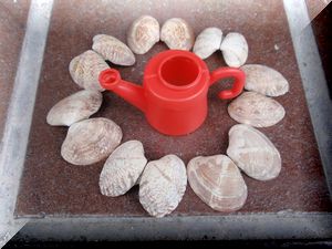 我が家に来たかわいい7粒のアサリちゃん、その夜には食べず塩水につけていました。