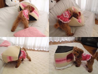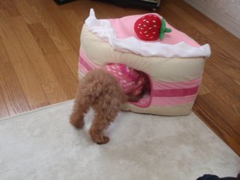 シッポは立っていますが、ケーキをひっくり返し頭を突っ込んでいます。